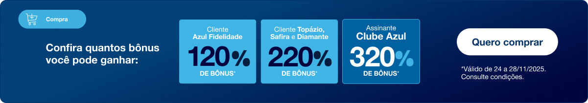 - Para ser elegível à bonificação de 320%, o cliente do Clube Azul deverá estar com assinatura ativa no plano no momento da compra;